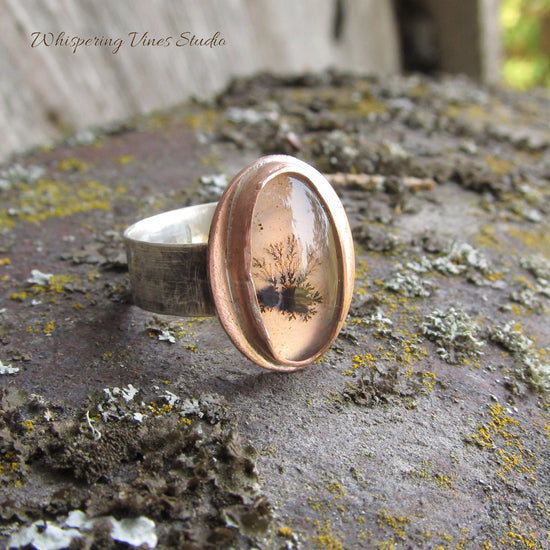 Our wildflower agate gemstone ring is a beautiful blend of nature and art. Crafted with a wide band of sterling silver that has been intricately hammered for a unique, vintage appeal, this ring is a glorious size 7.5. The majestic agate gemstone, known for its calming and soothing qualities, is delicately encased in a handmade copper bezel setting that adds a rustic charm to the piece.