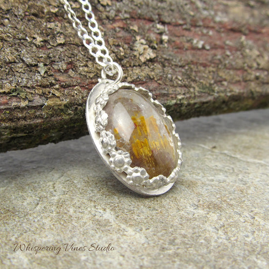 Handcrafted Cacoxenite Gemstone OOAK Pendant with Floral Sterling Bezel Setting and Sterling Silver 18'' Chain