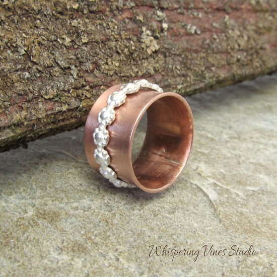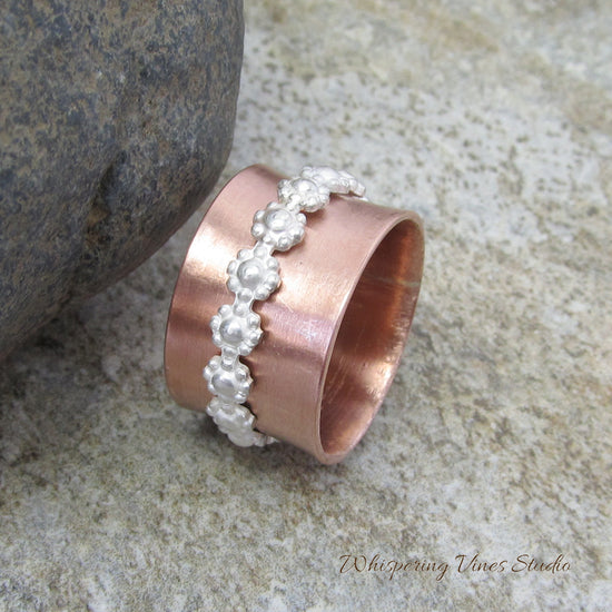 Illuminate your look with an exquisite touch of nature with our Sterling Silver Floral Spinner Ring. This beautifully designed ring integrates the elegance of sterling silver with the rustic charm of an uncoated copper band, forming an enchanting piece of jewelry that's hard to resist. The ring's main attraction lies in its spinning floral motif, designed to provide a soothing, spinning motion that's as calming as it is mesmerizing. The thoughtful design of this spinner ring resonates with the joy and beauty of a blossoming garden. Each piece is meticulously handcrafted by myself, ensuring an unparalleled level of quality and attention to detail. Experience the allure of a flower garden on your finger with our sterling silver floral spinner ring, a piece of jewelry that's as unique as you.