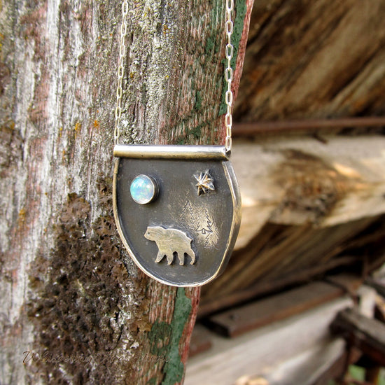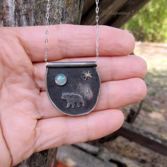 Handmade Sterling Silver Necklace with Bear Silhouette, Ethiopian Opal Moon and Gold Foiled Star Burst - 20 Inch Chain