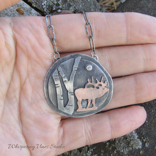 Sterling Silver Elk Pendant with Birch Tree Motif: An Exclusive, Handcrafted Nature Jewelry Piece
