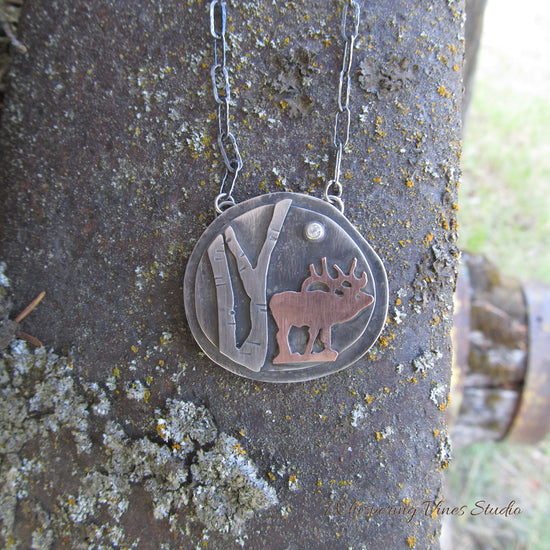 Experience the tranquility of the wild, encapsulated in the form of an alluring piece of jewelry. Presenting a sterling silver pendant featuring a graceful elk nestled within an intricately designed birch tree. Handcrafted to perfection in my Montana studio, this majestic piece serves as a constant reminder of nature's scenic beauty. The elk pendant, posing as a symbol of strength and endurance, is meticulously detailed, highlighting the raw beauty of the wild. A beautiful white topaz gemstone serves as the shining star. Hanging from a sturdy 24" link chain, this pendant is the perfect layering necklace. The birch tree motif, a symbol of new beginnings, adds an elegant touch to this one-of-a-kind piece. The use of sterling silver adds a hint of luxury, ensuring a statement piece that can stand the test of time. This necklace is not just a piece of jewelry, it's a piece of art that brings the calm and serenity of nature close to your heart.